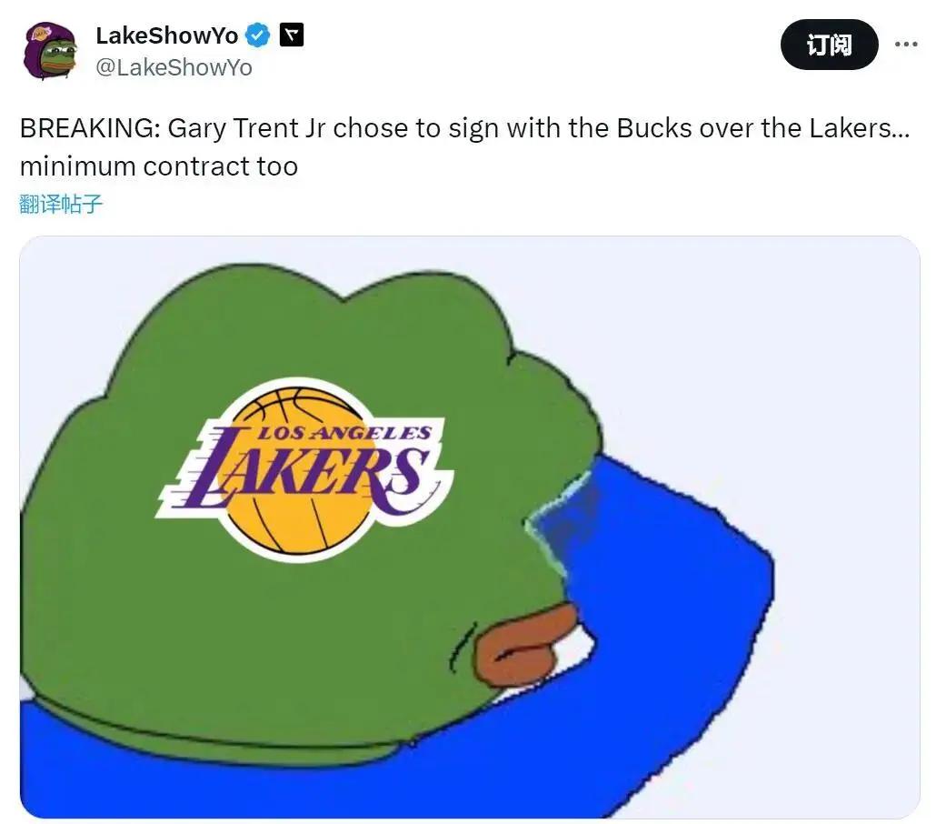 今年夏天,湖人错失太多球员。一家湖人媒体直接破防,这样写道:同样是底薪,特伦特拒绝湖人,选择了雄鹿。另据湖人记者Anthony Irwin报道,雄鹿给了特伦特首发位置的保证,而湖人没有这种承诺,所以特伦特选择了雄鹿。