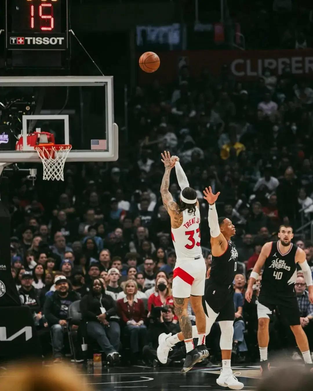 再往前看,2022-23赛季,特伦特为猛龙打了66场,其中44场首发。场均出战32.1分钟,砍下17.4分2.6篮板1.6助攻1.6抢断,三项命中率:43.3%,36.9%,83.9%。生涯7个赛季,他场均14.3分2.4篮板1.5助攻1.2抢断。