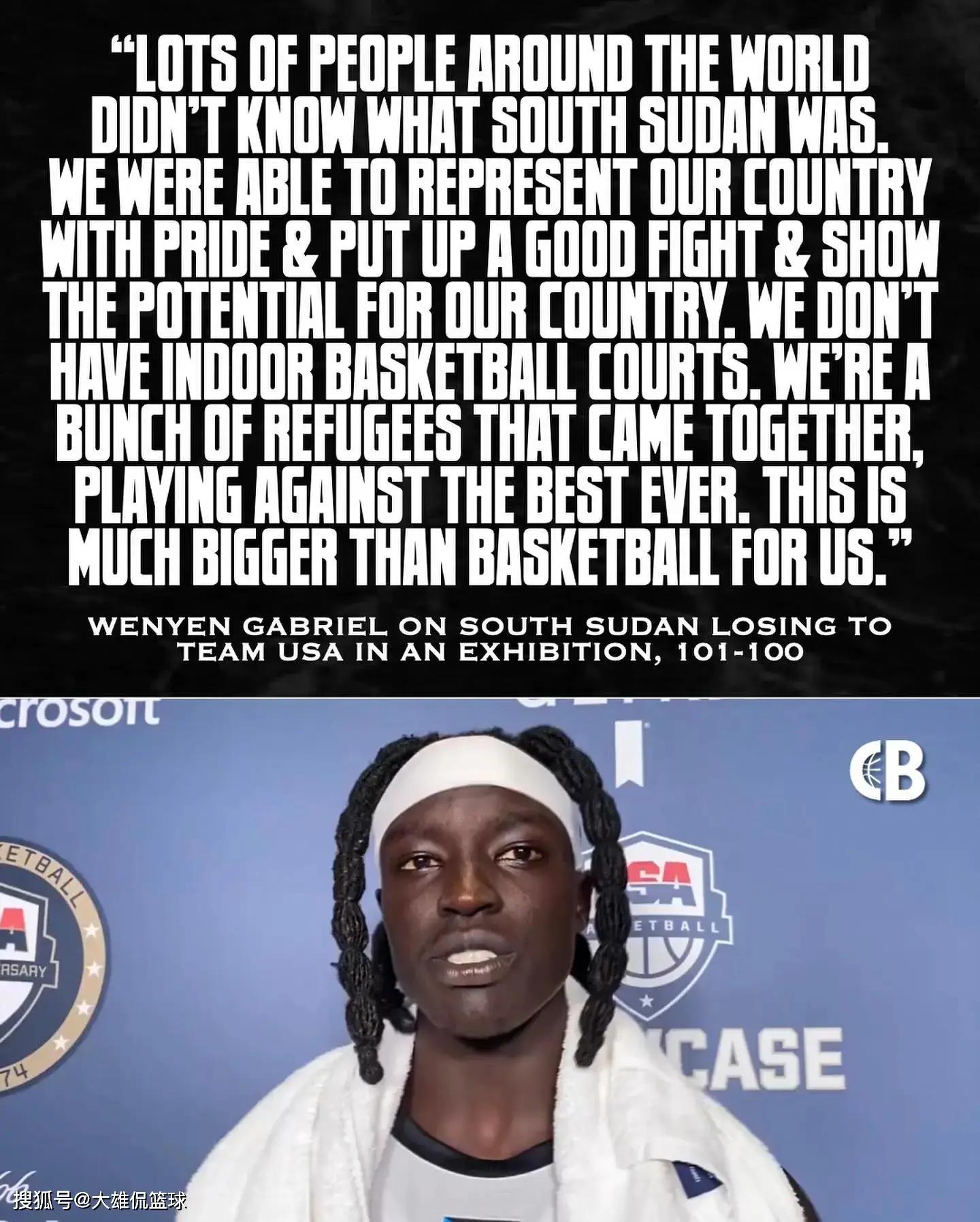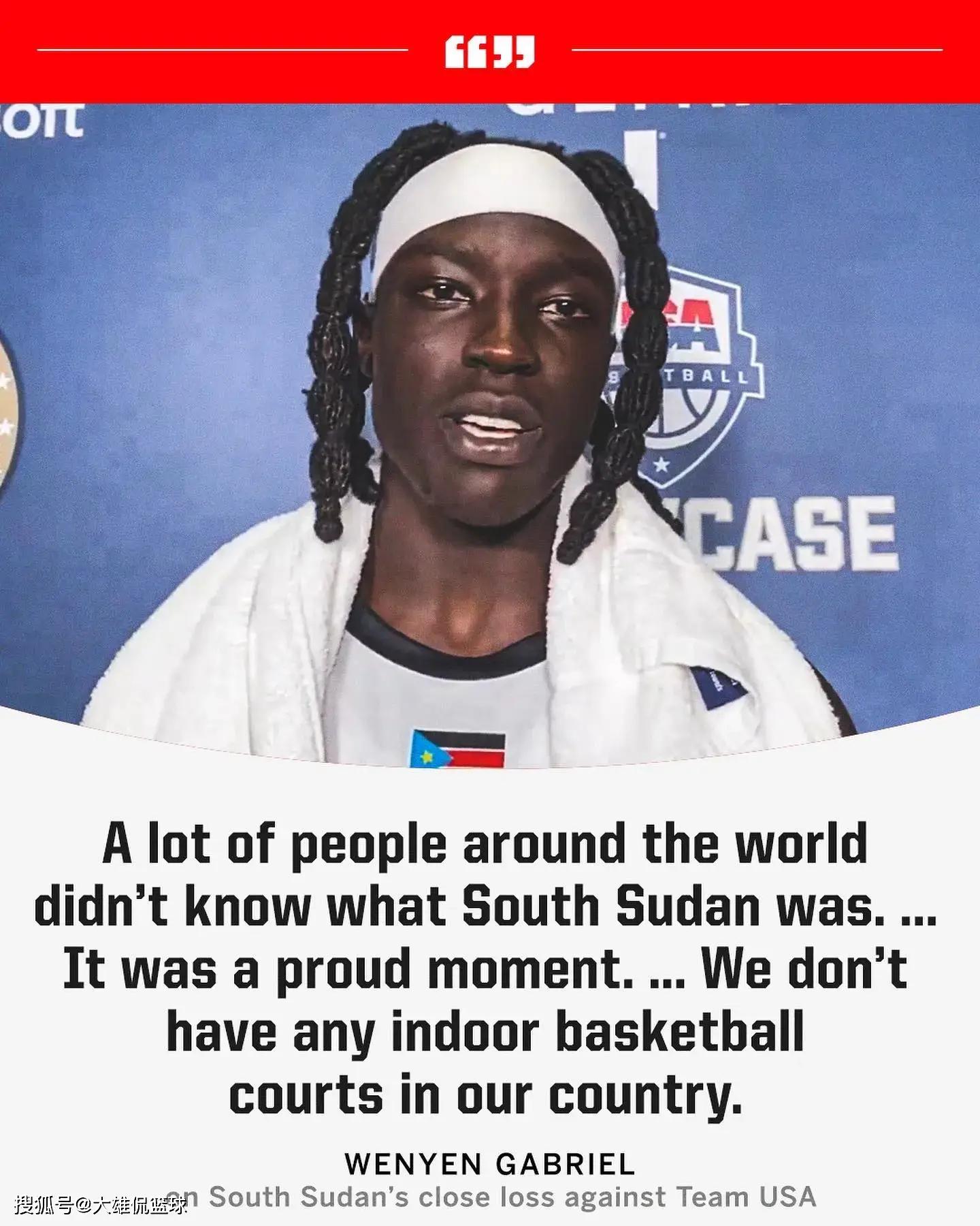 南苏丹男篮的核心领袖之一的前湖人球员加布里埃尔,在惜败美国男篮之后,也是谈到了南苏丹男篮恶劣的打球环境。在他的描述下,我们中国男篮真的无地自容。
