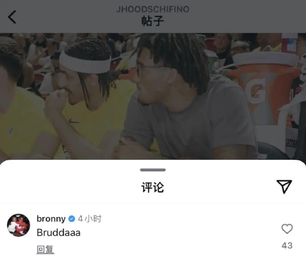 湖人球员希菲诺更新社交媒体,晒出自己观战夏季联赛的照片,布朗尼在底下评论区留言:“兄弟!”