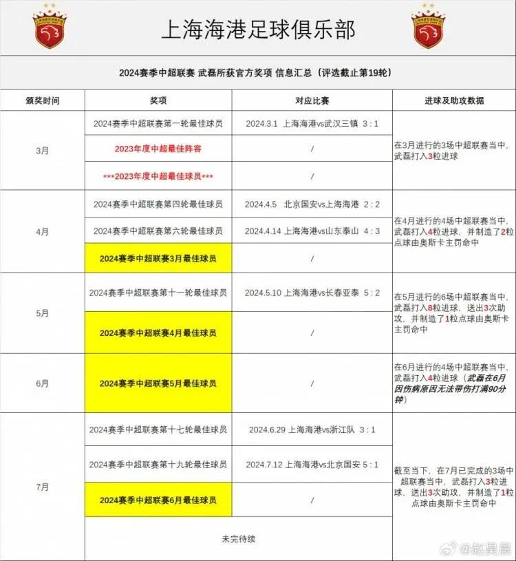 直播吧7月22日讯 上海海港俱乐部新闻官赵昊晨在社媒晒出了截至本赛季第19轮武磊个人所获的全部奖项。