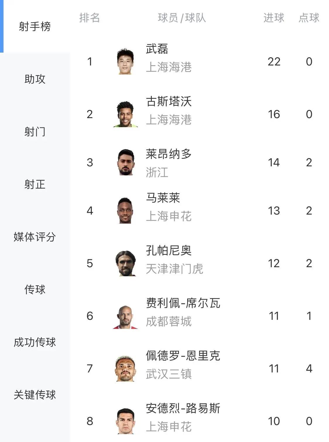 直播吧07月23日讯 中超第24轮比赛,上海海港主场5-0击败青岛海牛,古斯塔沃戴帽,本赛季中超进球数来到16球,在射手榜排名第二直逼武磊。