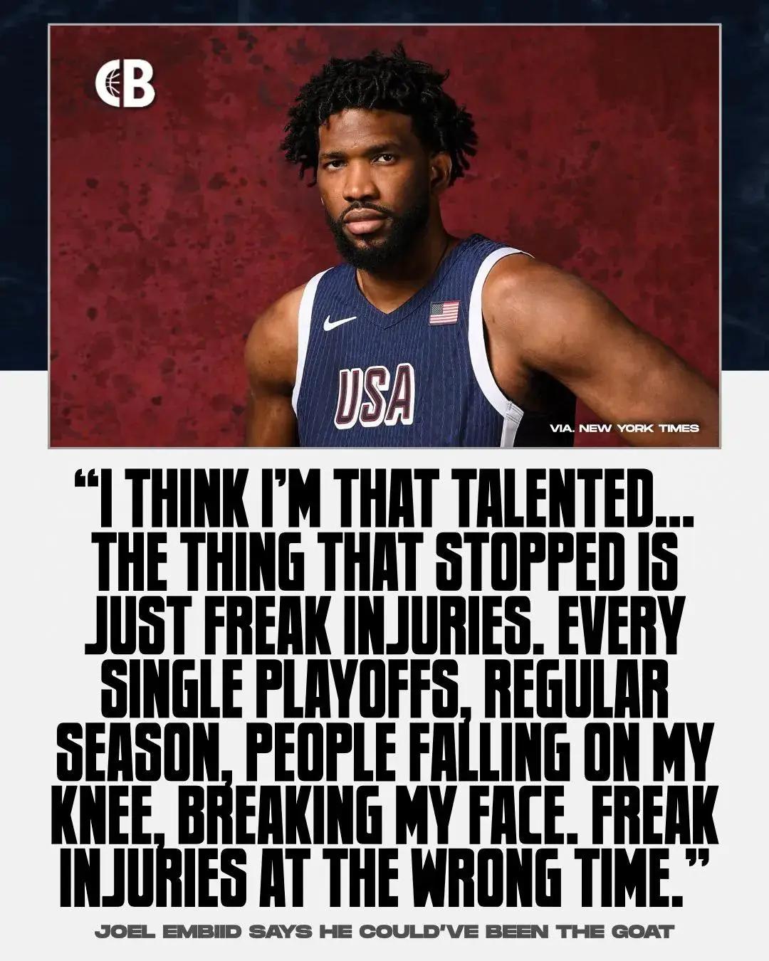 今年夏天,恩比德不仅仅在播客中贡献疯狂语录。此前接受记者采访时,恩比德说道:“我觉得我非常有天赋。如果不是经常受伤,我本可能成为GOAT(历史最佳球员)。你想想,过去总有人撞到我的膝盖和我的脸,导致我受伤。”