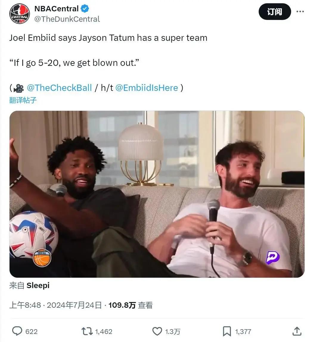 同样是今天,恩比德大嘴巴也惹事了。他在另一档播客当中说道:“是的,我说过‘如果我有超级球队,我也能赢’!我跟塔图姆还说过,如果我20投5中,那我们的球队会被对手打爆。”意思很简单:塔图姆不行,只因为绿军是超级球队。
