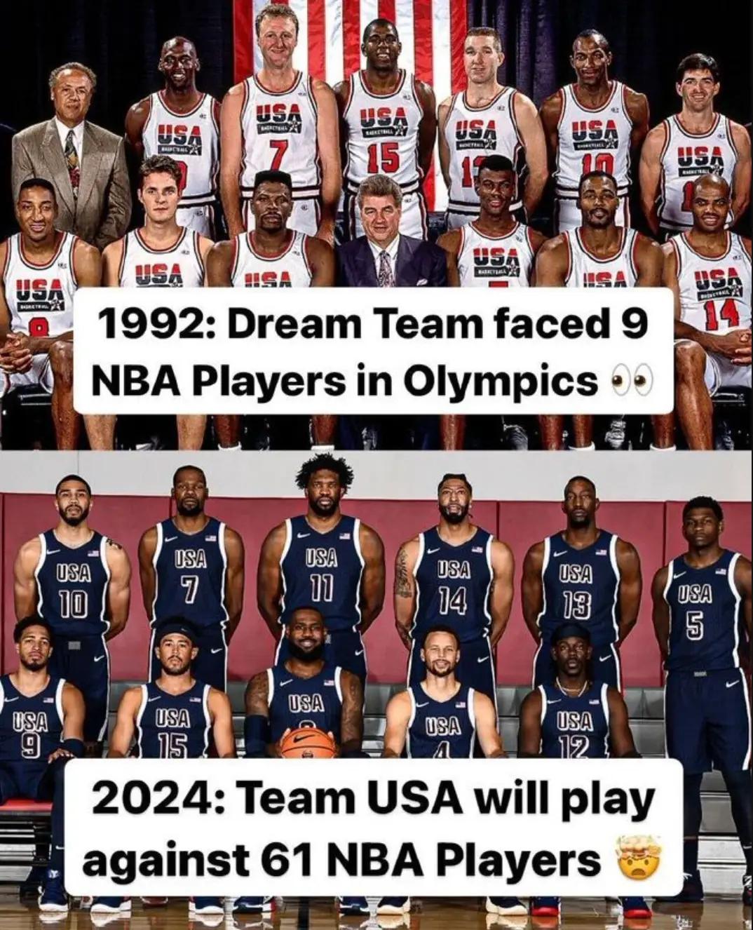 当然了,热身赛主要就是练兵,看看队友之间的默契程度,相信美国队也没有发挥出百分百的实力。1992年,奥运美国男篮只要面对9名NBA球员。今年的美国男篮要面对61名。说明,国际赛场的球队,实力都在显著增加。