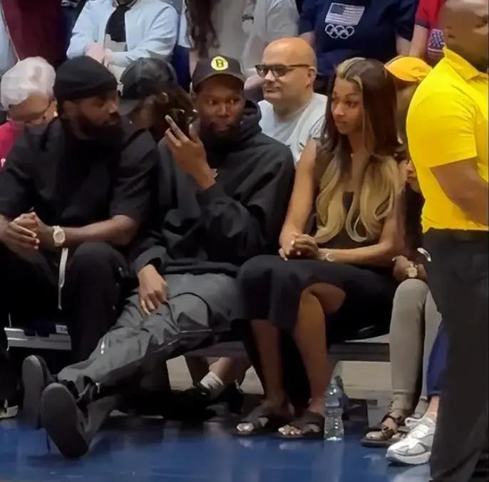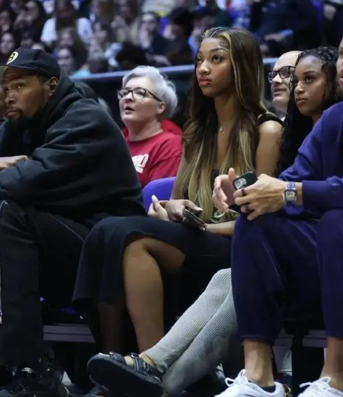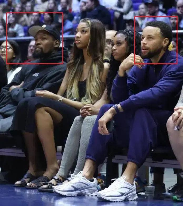 与此同时,细心的球迷发现,在库里和杜兰特中间坐着两位美女,其中一人是Wnba的球员安吉尔-里斯,主动选择坐在靠近杜兰特的位置。