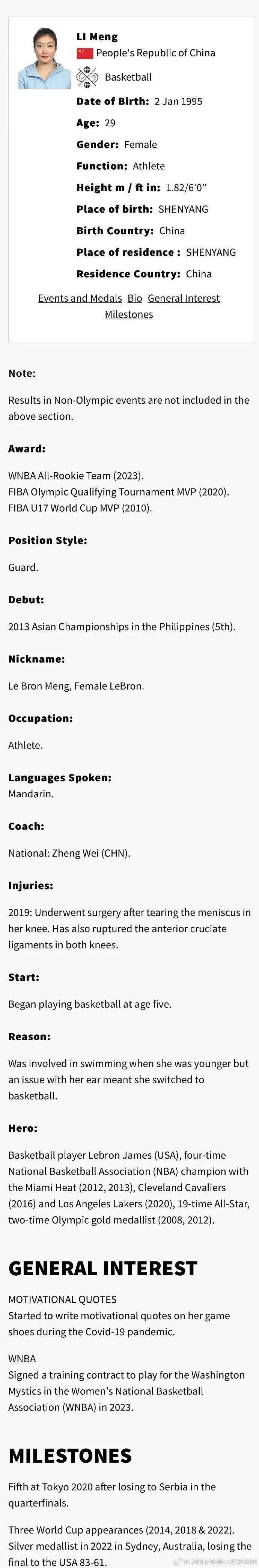 直播吧7月26日讯 今天,中国女篮球员李梦的奥运会简历出炉了。