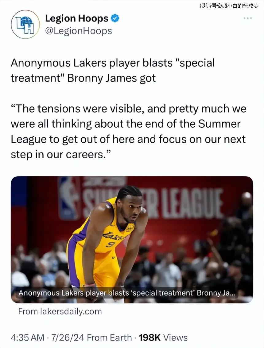 北京时间7月26日,根据NBA记者萨姆-阿米克的报道,一位不愿透露姓名的湖人夏季联赛球员爆料,布朗尼-詹姆斯的存在让队内气氛紧张,他本不该得到那个位置,他被当做特殊成员来对待,这让队内球员感到烦躁因为所有人看不到所谓的化学反应。
