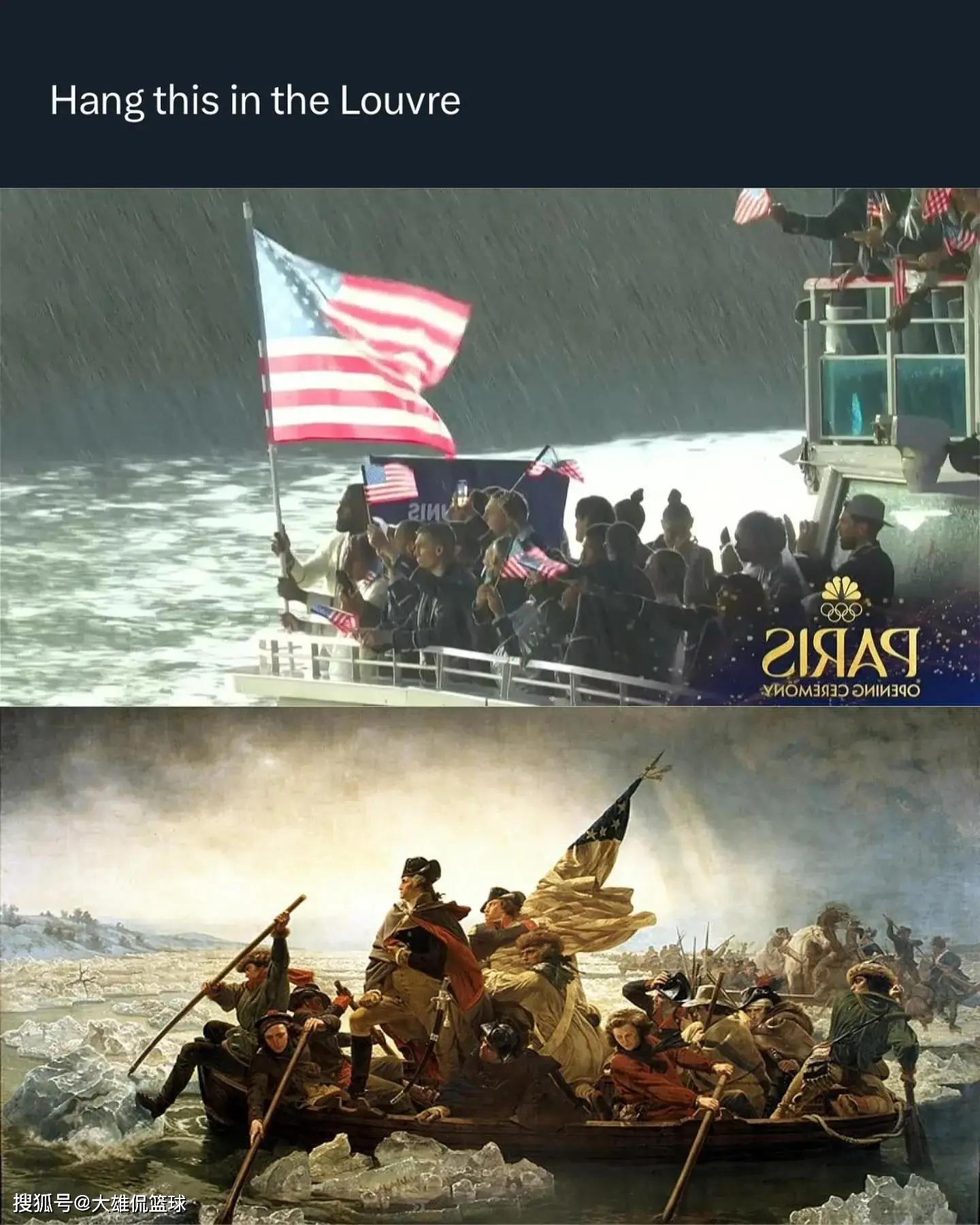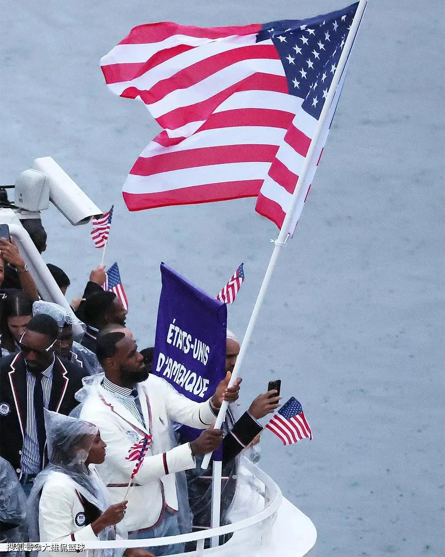 可惜,奥运会开幕仪式天公不作美,下起了大雨,不过勒布朗詹姆斯面对如此殊荣,也是在倾盆大雨中自豪地举着他手中的美国国旗。