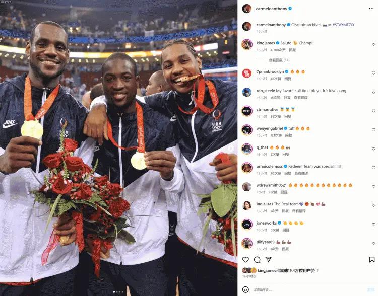 直播吧7月27日讯 昨天,NBA名宿卡梅隆-安东尼晒出了自己和詹姆斯韦德曾经的合影,并写道:“奥运档案。”