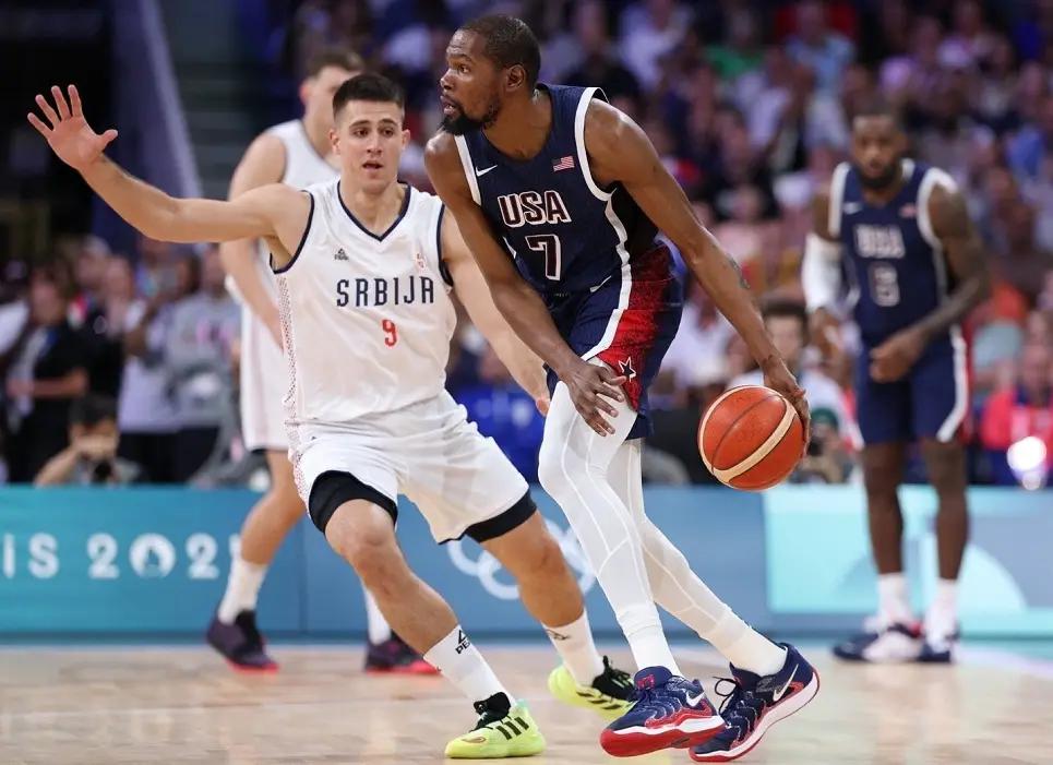 以NBA超级球星为核心班底的美国男子篮球队,凭借极具统治力的表现,成为了球迷眼中的梦之队,不过随着国际篮球的迅速发展,美国队在世界大赛上的优势已经越来越小,为了展现自己的霸主地位,美国队在巴黎奥运会上打造了詹姆斯、库里和杜兰特三大顶级球星为核心班底的华丽阵容,目标也只有一个,那就是站上冠军领奖台!这一个比赛日,美国队在小组赛首战,遭遇到了约基奇和博格达诺维奇领衔的塞尔维亚,本场比赛在约老师的率领下,塞尔维亚给梦之队制造了非常大的麻烦,可惜他们遇到了无解的杜兰特,凭借着他替补登场后死神降临的发挥,美国队也以110-84击败了塞尔维亚,取得了巴黎奥运会的开门红!