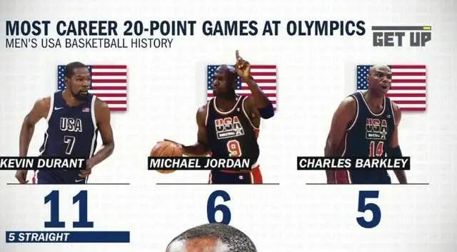 而在比赛结束之后,美媒NBA Central也是晒出了美国男篮奥运历史上单场20+次数前三。其中杜兰特拿到了11次,位列第一位,乔丹六次位列第二,巴克利五次位列第三。而且杜兰特最近五场比赛都是拿到了20+的得分,足以证明他的恐怖。
