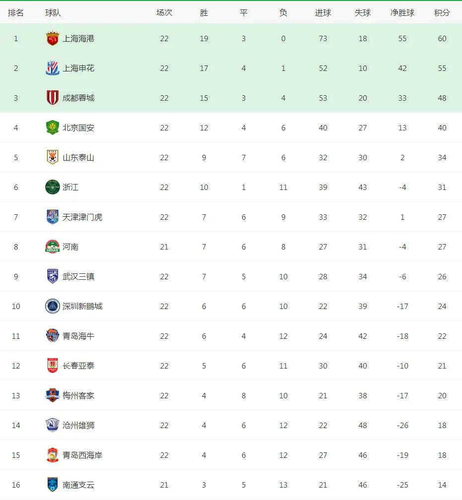 作为中超卫冕冠军,上海海港以19胜3平积60分的不败战绩继续占据领头羊位置,领先同城老大哥上海申花的优势从2分扩大到5分。