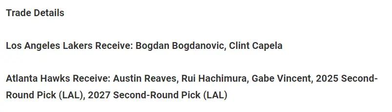 据悉,该媒体认为洛杉矶湖人可以尝试着将八村塁、加布-文森特、奥斯汀-里夫斯、2025年次轮选秀权(来自于洛杉矶湖人)、2027年第二轮选秀权(来自于洛杉矶湖人)送到亚特兰大老鹰,以寻求通过5换2得到博格丹-博格达诺维奇和克林特-卡佩拉!这是一笔7人交易的模拟,其从涉及到的球员和对2024-25赛季NBA格局的影响,无疑称得上“史诗级”!