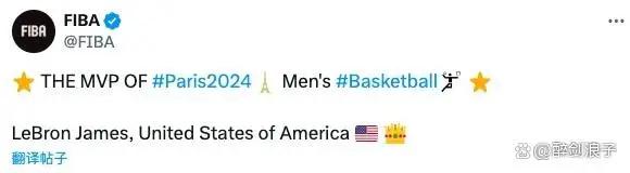 率领美国拿下金牌后,40岁的詹姆斯也荣膺国际篮联评选的奥运会男篮比赛MVP奖项。