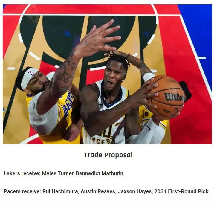 具体方案:湖人队送出八村塁、里夫斯、海斯、31年首轮得到迈尔斯·特纳和马瑟林。