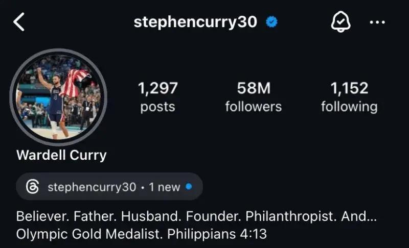 库里更新了Ins主页个人简介,将“金州勇士后卫”改成了“奥运金牌得主。”