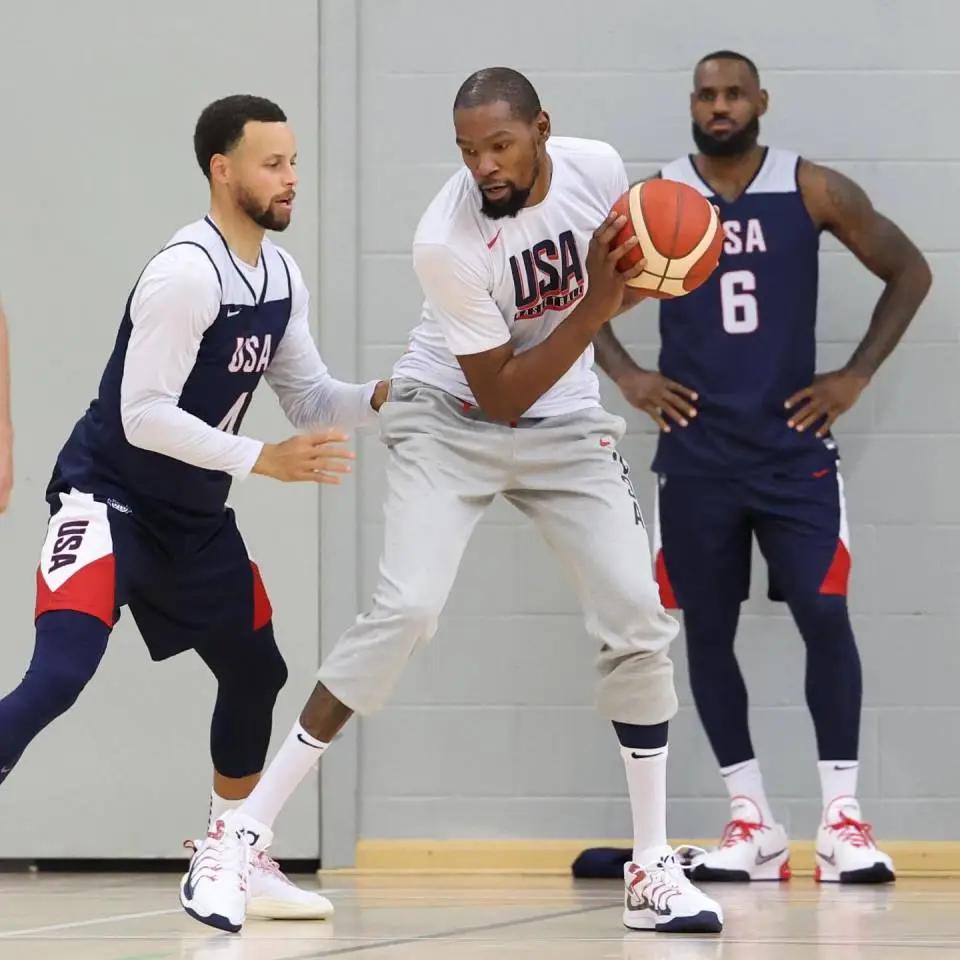 第一张是奥运夺金后的合影,另一张则是队内训练库里防守杜兰特,詹姆斯在身后观察。