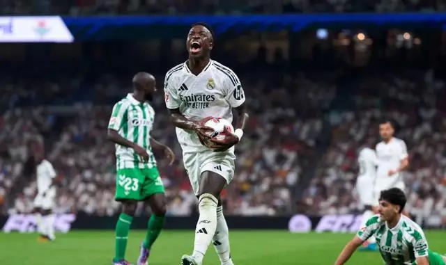 第75分钟,维尼修斯在禁区内带球突破时被皇家贝蒂斯门将犯规,裁判在查看VAR后判给皇马一个点球。虽然维尼修斯自己并未主罚点球,而是将主罚权交给了姆巴佩,姆巴佩没有辜负队友的信任,将点球稳稳打进,完成梅开二度,最终帮助皇马以2-0击败皇家贝蒂斯。
