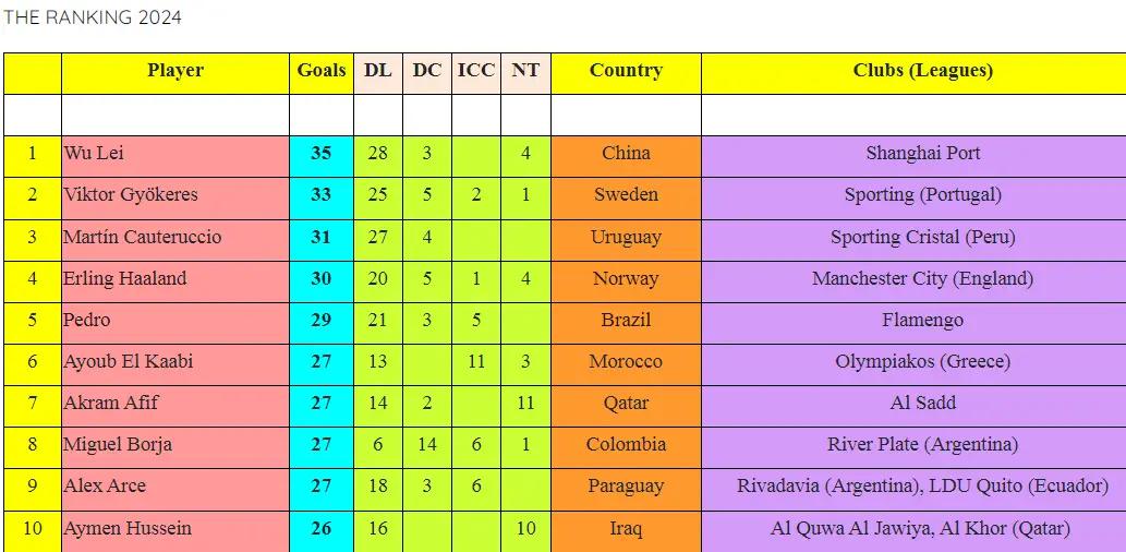 在IFFHS统计的2024年世界足坛射手榜,效力于上海海港队的武磊以35球高居第一位。武磊的35粒进球之中,其中28球发生在中超赛场,还有3次来自足协杯,另外还在国家队比赛中打入4球。