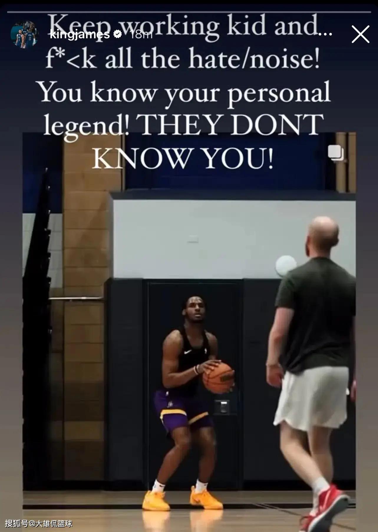 詹姆斯在个人社交媒体上发文图文表示“继续工作,小子,去他M的,所有的仇恨/噪音!你知道你的个人传奇!他们不了解你!”