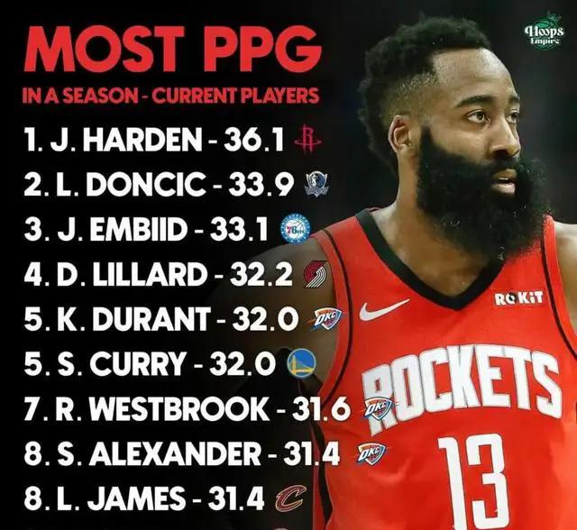 凯文·杜兰特与斯蒂芬·库里同以场均32.0分并列第五。杜兰特凭借优秀的身高和投射能力,在俄克拉荷马雷霆时期展现出了超群的得分才能。而库里是金州勇士的绝对核心,他那改变篮球打法的三分球能力,有力推动了现代篮球的发展。