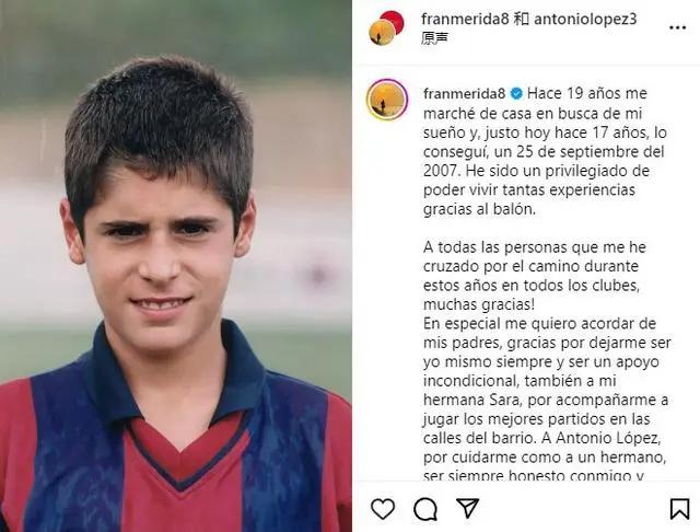 最近,已年届34岁的西班牙球员梅里达宣布意外退役。这一决定令人吃惊,尤其考虑到他刚刚离开中超,并且完全有能力在那里立足。然而,他选择在34岁时退出赛场,这实属可惜。梅里达在社交媒体上晒出小时候身着巴萨球衣的照片。他表达了18年前追逐足球梦想时家人无条件的支持之情,感谢妹妹童年时陪伴并踢球的时光,也对许多帮助过他的人致以感激之情。