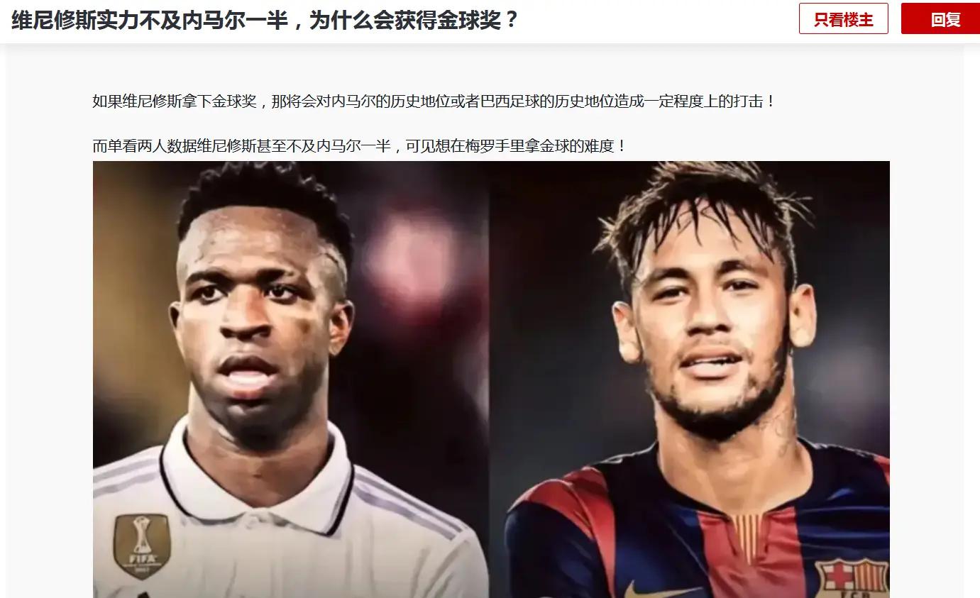 谈到将维尼修斯和内马尔进行比较,内马尔是与谁竞争金球奖呢?那个黄金时代的梅西和C罗!而维尼修斯则是与一群普通球星竞争,这简直就是菜鸡相互攻击。而内马尔之所以没有获得金球奖,并不是因为他竞争不过维尼修斯这种级别的球员。