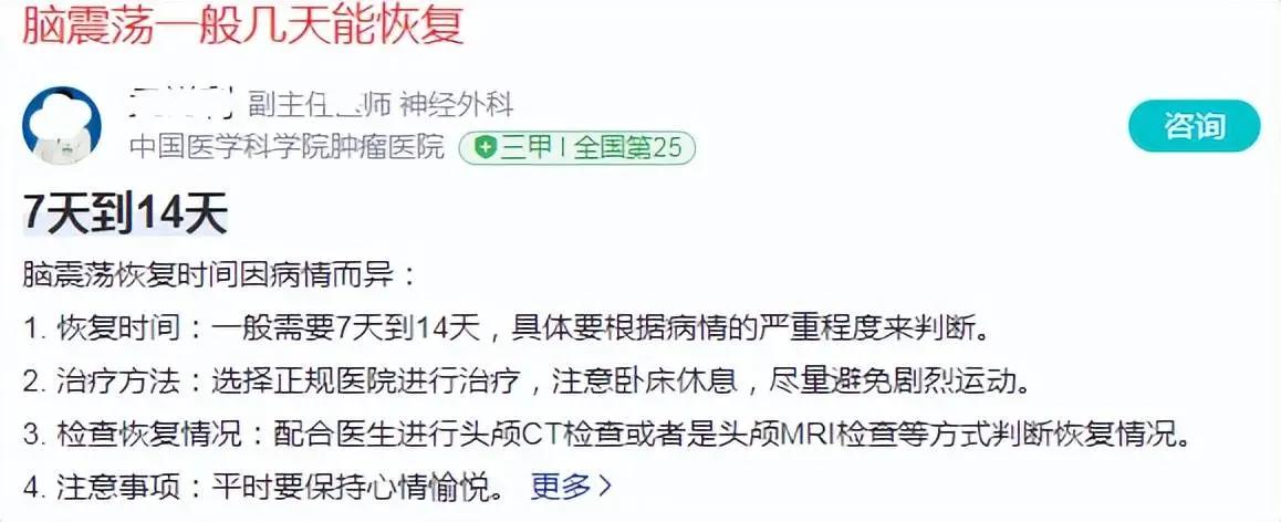 一般情况下,撞到后脑勺更容易导致脑震荡,而撞到前额的脑震荡概率较小。然而,在中超联赛的赛场上,情况却恰恰相反。这不禁让人怀疑脑震荡是否存在。从医学角度来看,脑震荡需要一个恢复期,大约是7到14天(下图)。