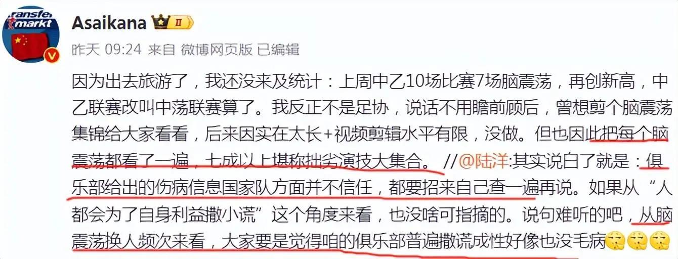 根据陆洋的看法,从脑震荡换人频率的角度来看,如果大家认为我们球队普遍存在撒谎的问题,那也无可厚非。此外,德转管理员朱艺也表达了类似的观点。他在详细研究了中超、中甲和中乙这三级联赛中的脑震荡换人情况后,认定其中大部分都呈现出了拙劣的演技。