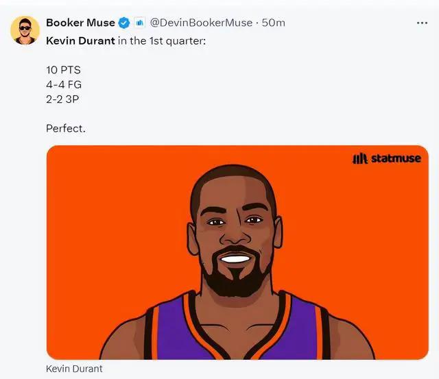 在第四节,太阳并没有再次派出先发阵容,布克出场22分钟只有10分3助攻,比尔出场20分钟得到12分6篮板3助攻,两人的表现与上一场并无太大差异,唯独杜兰特在全场比赛18分55秒内打出了12中8+三分6中4的高效表现,拿下21分3篮板2助攻1抢断且零失误,命中率高达66.7%。