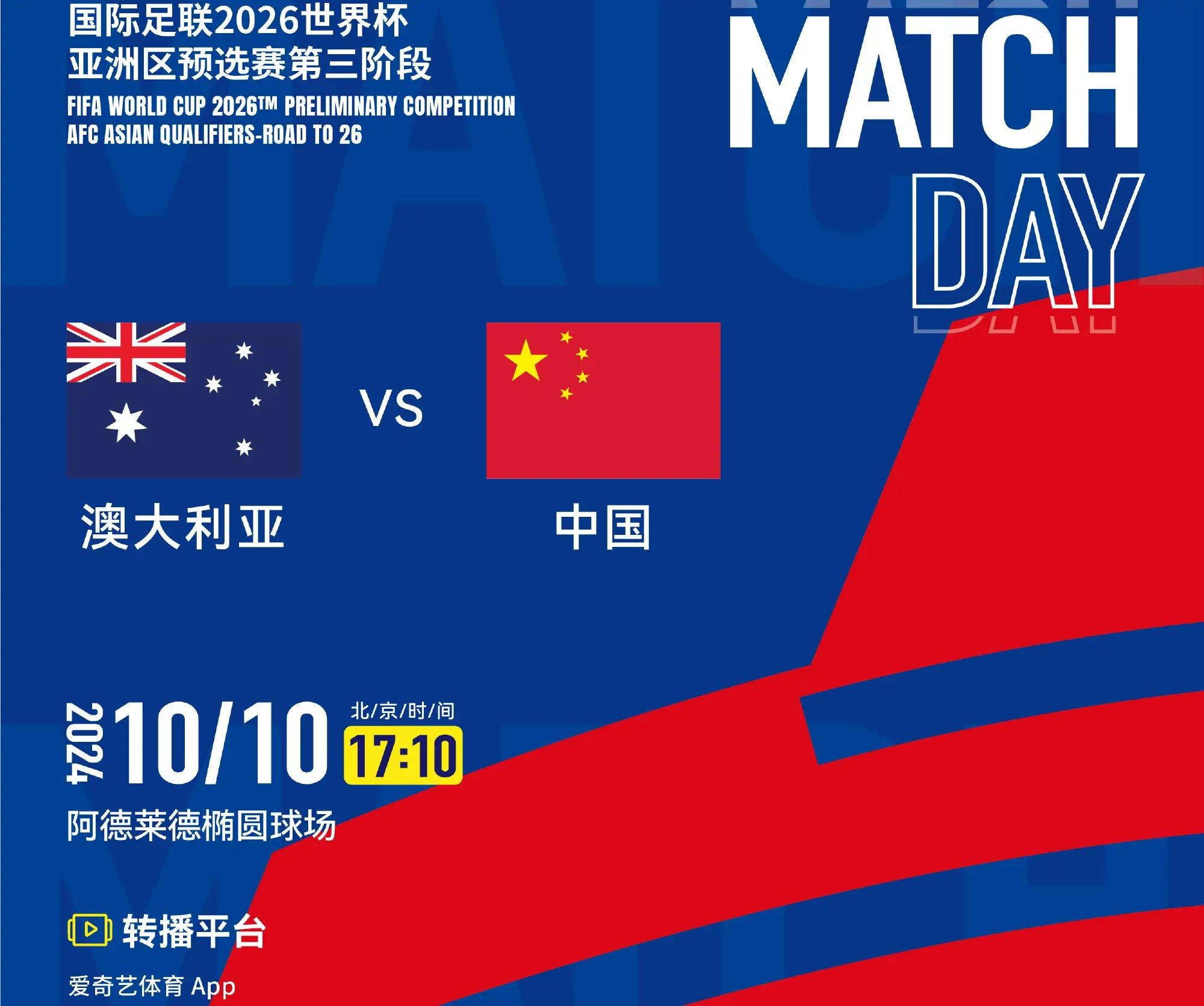 北京时间10月10日晚(今晚)17时10分,国际足联(FIFA)2026年世界杯亚洲区预选赛第三阶段(18强赛)小组赛C组第3轮的一场比赛在阿德莱德椭圆球场上演,中国男足国家队远赴大洋洲,客场挑战袋鼠军团澳大利亚男足。