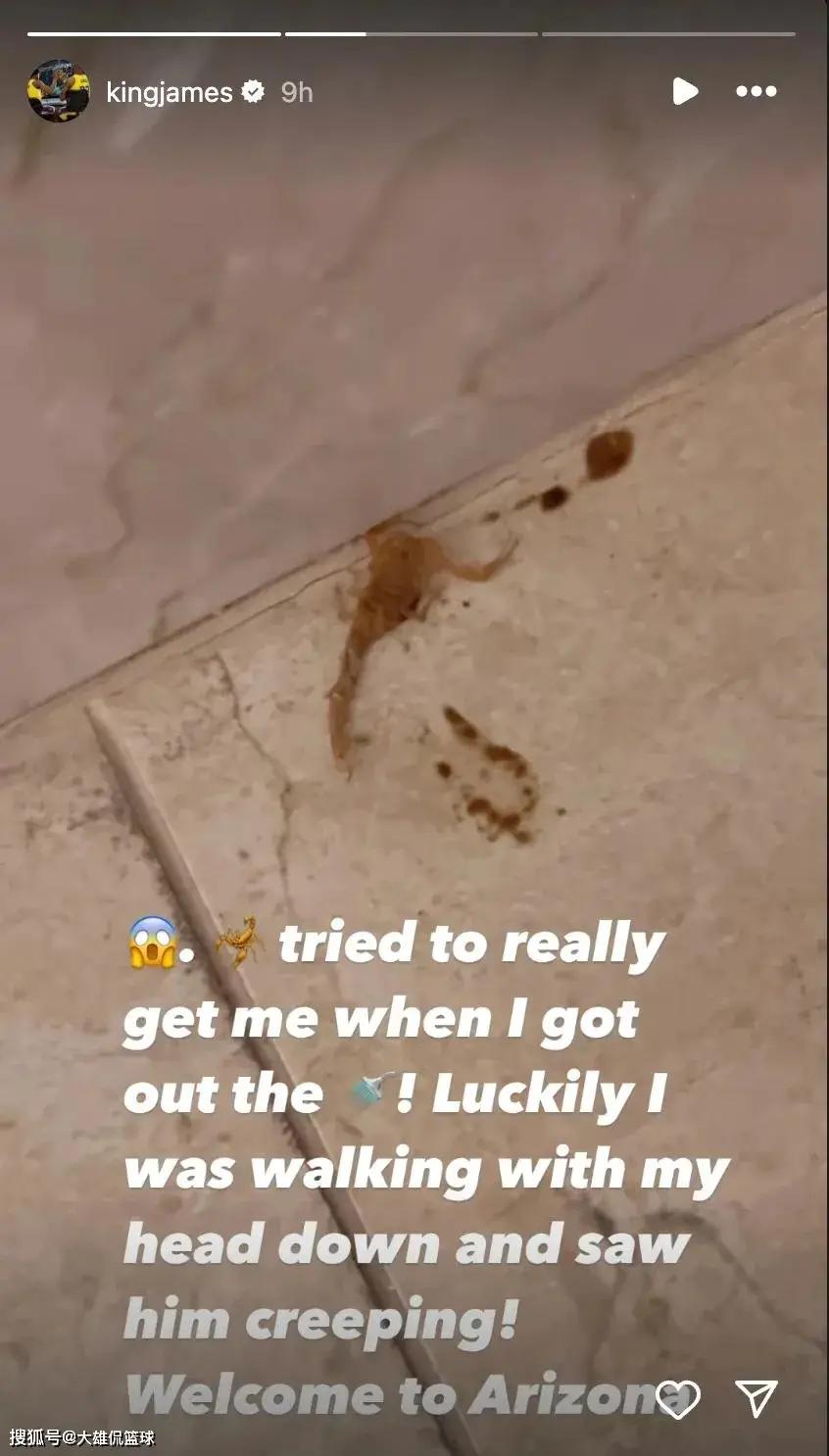 勒布朗詹姆斯发文道“蝎子试图在我洗澡的时候抓住我。还好,我当时低着头走路,看见他在爬!欢迎来到亚利桑那州。”