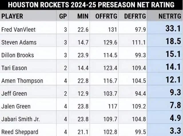 尽管季前赛胜负并不决定一切,但却能帮助球员找到最佳状态。美媒晒出了火箭全队的季前赛效率值排名。其中,30岁主控弗雷德-范弗里特遥遥领先,而中锋阿尔佩伦-申京则垫底,绰号“白魔”的卡姆-惠特摩尔也表现低迷。