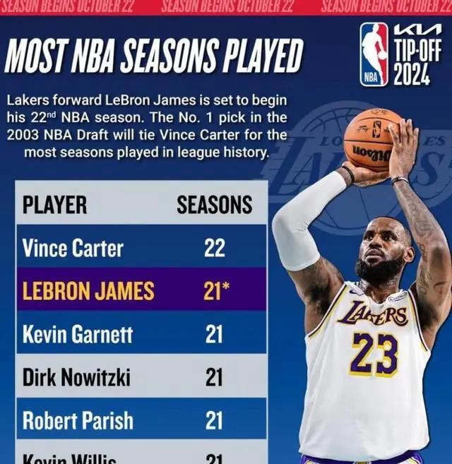 首先,根据NBA大数据统计,扣篮王卡特出战22个赛季,詹姆斯即将迎来他的第22个赛季,这将使他并列NBA历史第一。詹姆斯的独特之处在于他仍保持着巅峰状态,与其他同龄球员不同,续约合同也意味着他远未退役。