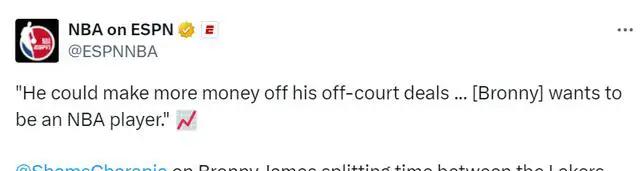 北京时间10月26日,根据ESPN报道,詹姆斯的大儿子布朗尼预计将随球队进行客场之旅后,前往发展联盟,开始他与该联盟间的训练与比赛。消息人士透露,布朗尼对于这样的安排毫不畏惧,甚至乐此不疲。尽管他本可以利用自身影响力在场外签约更多赞助商来赚取更多收入,但他选择了迈向NBA职业生涯,并把发展联盟作为打好基础的一环。