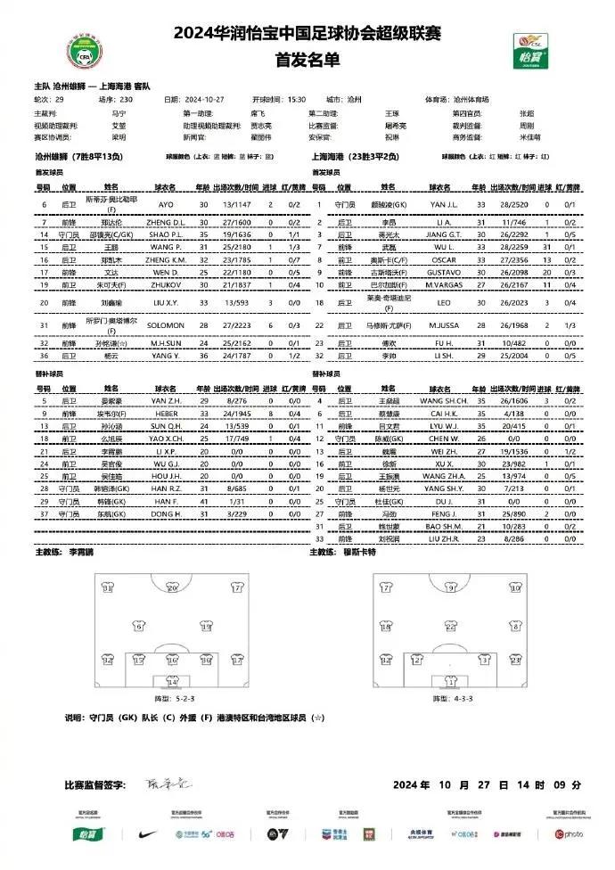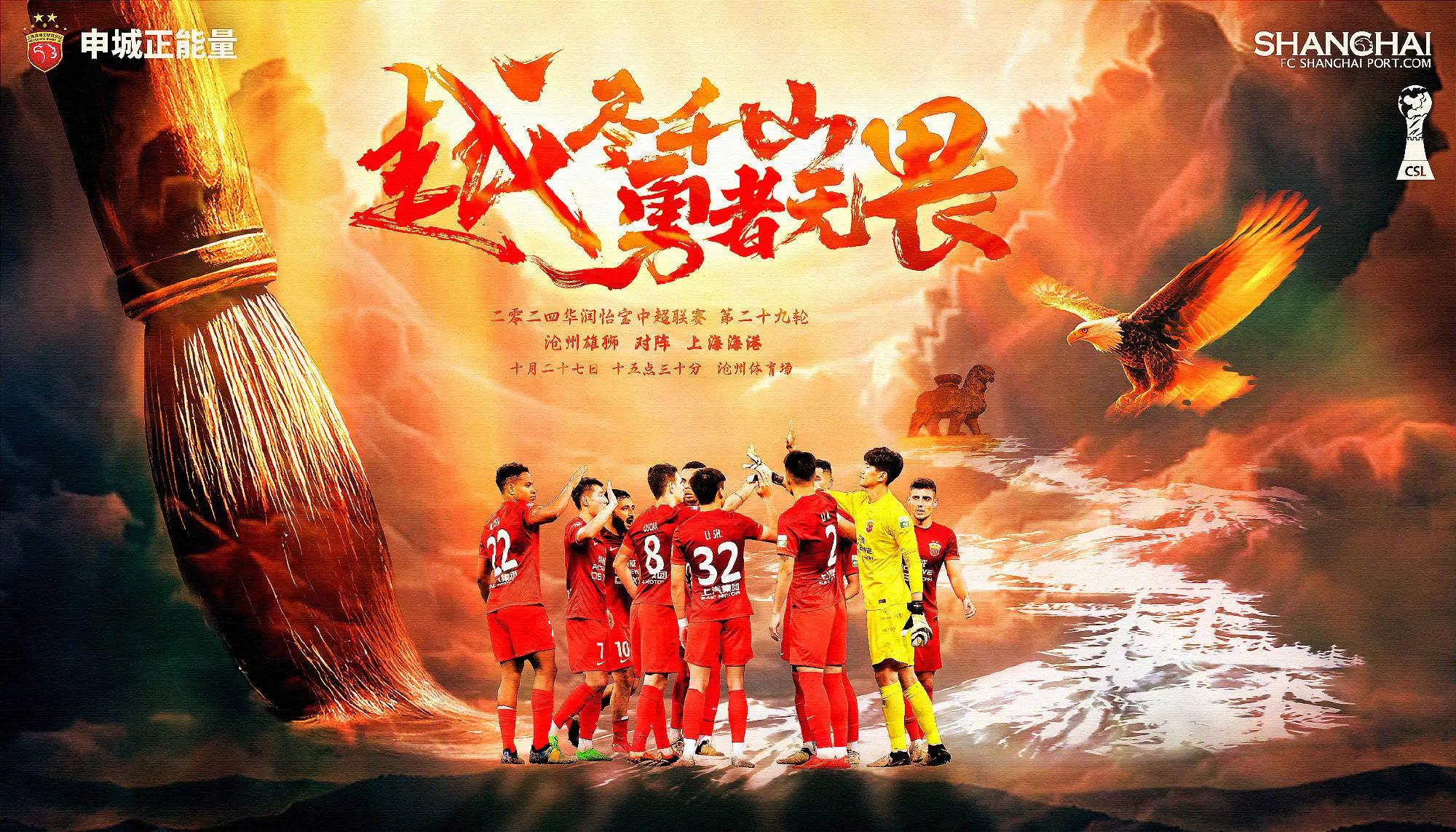 直播吧10月27日讯 北京时间15点30分,中超第29轮,上海海港客场挑战沧州雄狮,赛前双方首发公布。