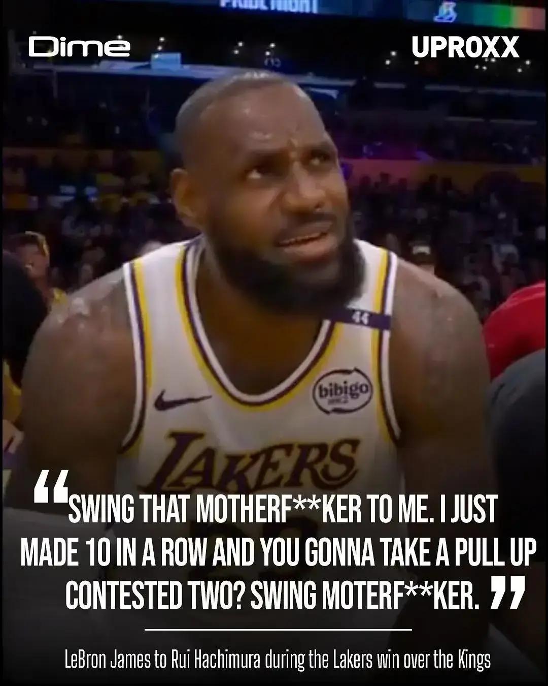 勒布朗詹姆斯怒斥八村垒时说道“GN养的,把那个球传给我,我刚连续拿到了十分,状态正佳,而你要急停干拔强投一记两分?转移球,转移,混蛋!”