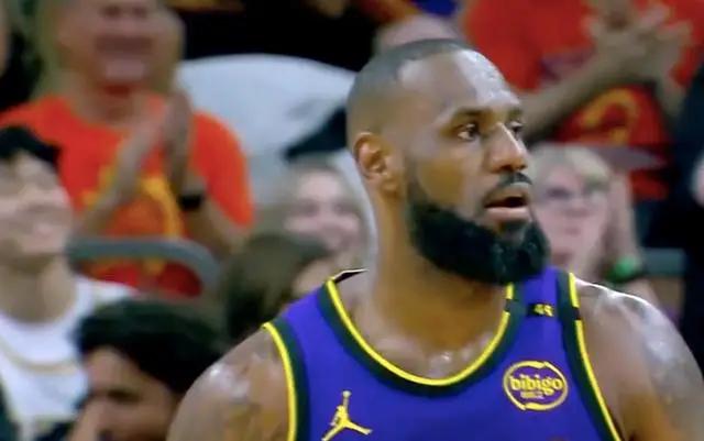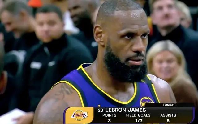 老詹示意对手有犯规,裁判没有任何表示,三节结束,湖人7分领先,詹姆斯只拿到6分。