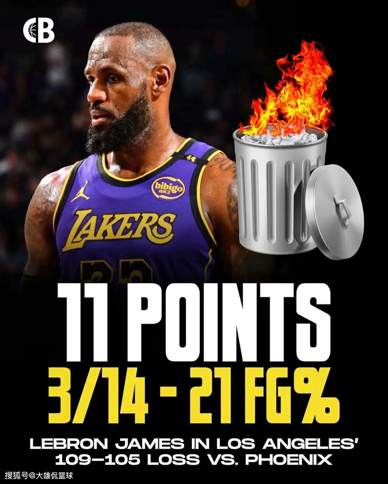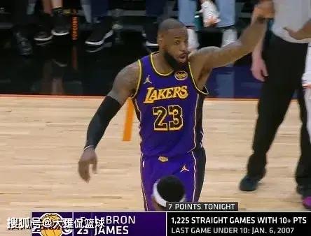 洛杉矶湖人被菲尼克斯太阳队逆转,勒布朗詹姆斯成为了这场比赛被逆转的罪魁祸首,整场比赛14投3中,三分球5投2中,贡献了11分,5个篮板,8次助攻。如果不是末节最后时刻投进一记三分球,估计勒布朗詹姆斯连续得分上双的记录,就此破灭。