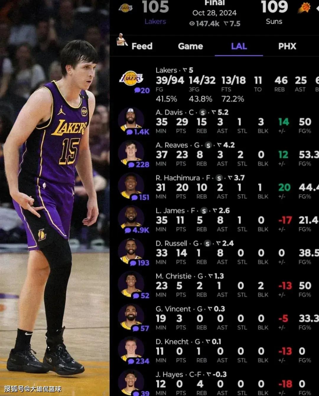 洛杉矶湖人2024-25赛季第四场比赛中,再次对阵菲尼克斯太阳队,洛杉矶湖人在上半场一度领先太阳队18分,可是湖人大意失荆州,让对方逆转比赛,最后凭借杜兰特末节的连续单打成功,反超并逆转比分。