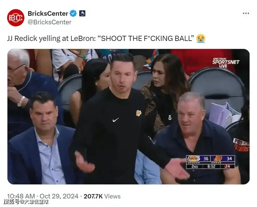 在上半场还有8分半钟的时候,雷迪克对于勒布朗詹姆斯没有及时投篮,导致球队24秒违例的行为,直接在场边默默爆粗口。甚至美媒BricksCenter,晒出了湖人主教练雷迪克爆粗口的内容,“TMD的,出手啊!”。