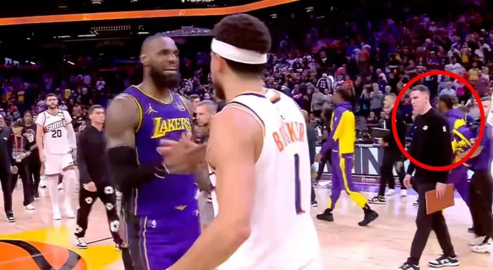 杜兰特拿下全场最高的30分并贡献8篮板4助攻4封盖,布克则砍下33分并在决胜时刻接连得分,为太阳稳固胜势,湖人这边,戴维斯虽然全场砍下29分15篮板,但其他球员的状态起伏使球队未能顶住太阳的反扑。赛后,詹姆斯在第一时间主动走向杜兰特和布克,与他们交换意见并相互鼓励,尽管湖人失利,但詹姆斯展现出的风度和对对手的尊重,赢得了场上场下的赞誉,这样的行为也反映出詹姆斯作为NBA标志性人物的领袖气质。他不仅带动队友拼尽全力,同时也以积极的态度接受比赛结果,这种不以胜负论英雄的胸怀让他在输球时依旧不失光彩。而詹姆斯的儿子布朗尼则悄悄退回了更衣室,布朗尼的成长一直备受瞩目,如今在正式比赛中并未得到太多的机会,直播镜头轻轻扫过。