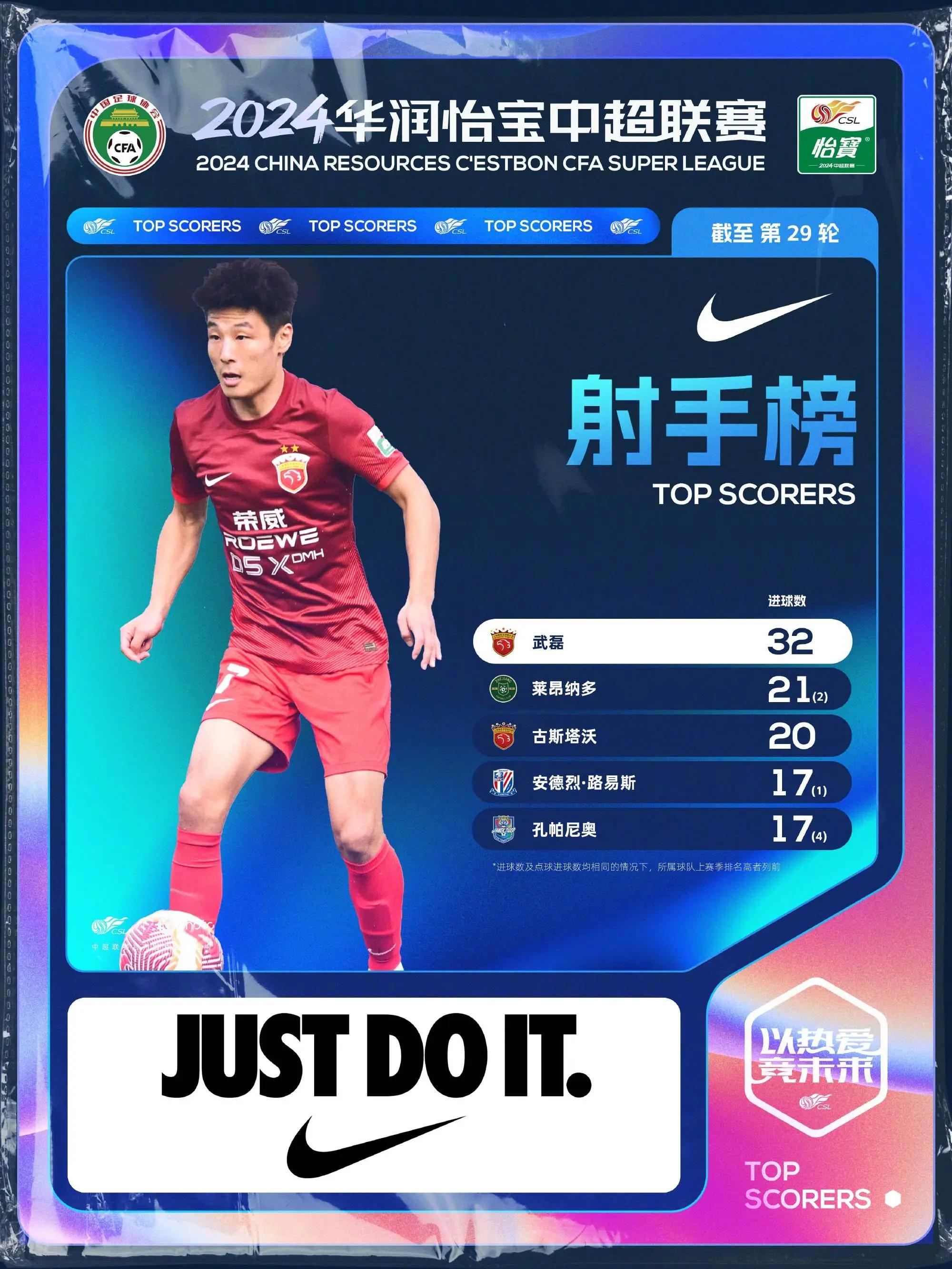 射手榜上,武磊32球居首,领先第三的古斯塔沃12球(第二的莱昂纳多停赛),锁定射手王。