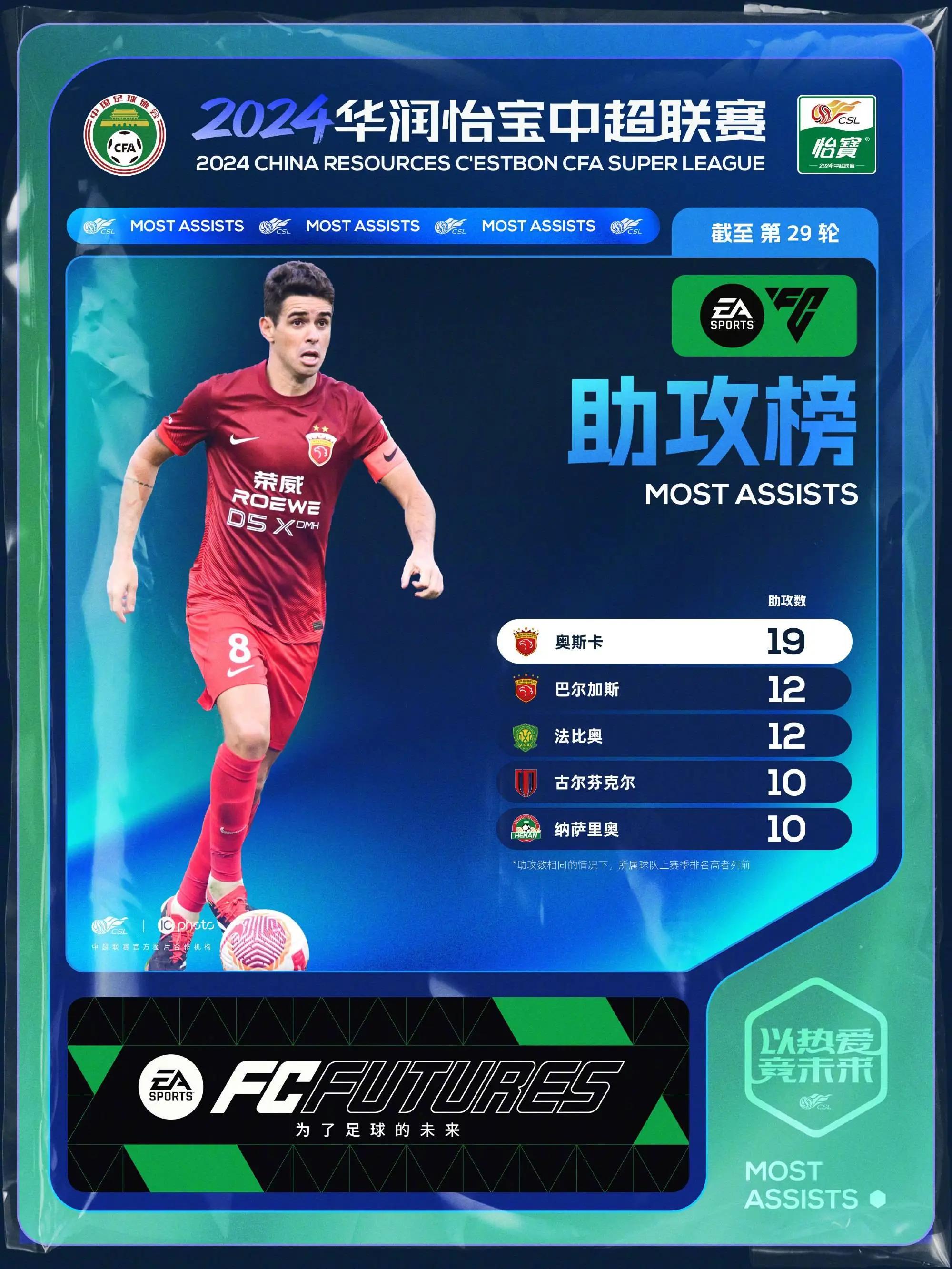 助攻榜上,奥斯卡19次助攻居首,比第二的巴尔加斯和法比奥多7次,锁定助攻王。