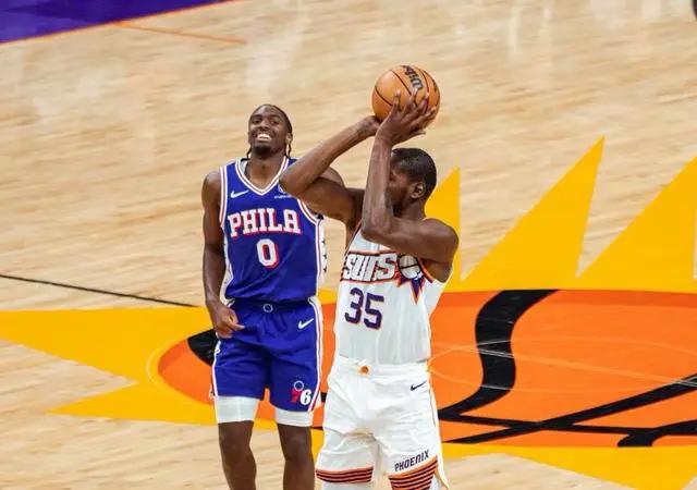 数据方面,76人这边,泰雷斯-马克西32分;保罗-乔治15分5篮板;盖尔雄-亚布塞莱19分7篮板6助攻;凯利-乌布雷11分;凯尔-洛瑞13分7助攻;埃里克-戈登10分。太阳这边,凯文-杜兰特35分4篮板6助攻;德文-布克13分6助攻;布拉德利-比尔17分;优素福-努尔基奇15分14篮板;罗伊斯-奥尼尔15分5篮板;格雷森-阿伦12分。 #百家观赛团#