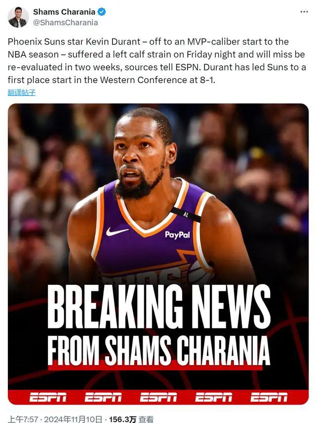 北京时间11月10日凌晨,三则伤病消息接连传出,引发广泛关注:1、太阳队前锋凯文·杜兰特因左小腿拉伤,将缺席两周,之后进行复查;2、孟菲斯灰熊的贾·莫兰特遭遇髋关节后脱位及一级骨盆肌肉拉伤,将定期每周观察;3、新奥尔良鹈鹕的锡安·威廉姆森因左腿筋拉伤,将无限期休战,并计划在未来几周内进行重新评估。