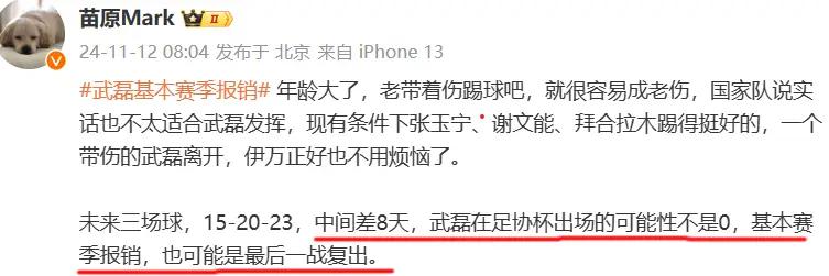 11月11日,武磊被曝赛季报销,将独自回国治疗。