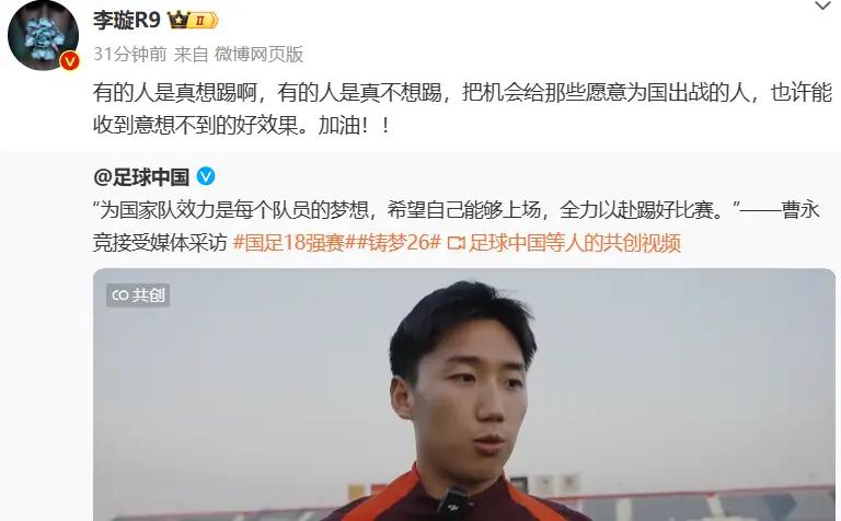 对此,足球报国内主任李璇也有话说。谈到国足新人曹永竞一腔热血欲为国足效力的表态,李璇写道:“有的人是真想踢啊,有的人是真不想踢,把机会给那些愿意为国出战的人,也许能收到意想不到的好效果。加油!!”这段话是在说谁呢?李璇的意思很明显:有的人不想为国出力,能不带就别带了,把机会留给那些渴望为国出战的球员可能会更好。
