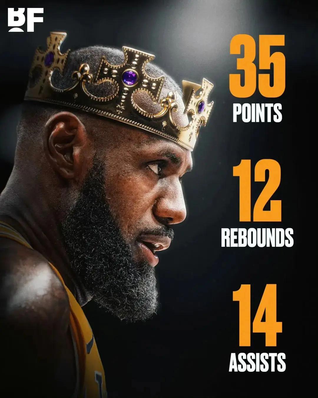 在这场比赛中,詹姆斯又一次砍下了三双的数据,他凭借着本场的35分12板14助攻,成为了NBA历史上连续3场达成3双的最老球员。